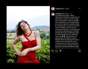 “Allora oficialmente Italiana. Cuando tenía 14 años tenía un sueño y era vivir en Italia así fue que empecé a juntar los papeles de la ciudadanía en el consulado donde yo vivía, una ciudad de un pueblo donde el consulado abría una vez por mes dos horas y te daban un turno con seis meses de anticipación; con esa paciencia fui juntando cada papel que me pedían durante varios años y finalmente todos en la familia obtuvieron la ciudadanía, menos yo, mis hermanos y mi papá; porque me faltaba un papel, y después de ahí me decepcioné mucho y cuando vivía en Buenos Aires nunca conseguía turno, me daba mucha fíaca, así es que me di por vencida. Hasta que después de 20 años, finalmente cuando conocí al equipo de @amada.italia pude cumplir este gran sueño”.