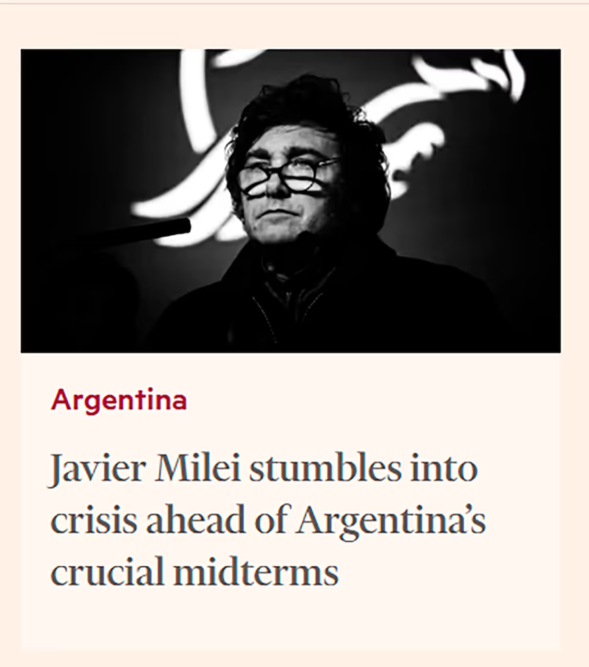 El diario británico Financial Times (FT) aseguró que el presidente Javier Milei atraviesa “la mayor crisis” de su gestión, en un contundente análisis del momento político que atraviesa el Gobierno en varios frentes. Según el medio, esto genera nerviosismo entre los votantes y los mercados a poco más de un mes de las elecciones de medio término del 26 de octubre.