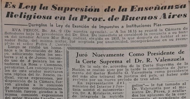 En el mes de diciembre de 1954 el gobierno produce una batería de medidas administrativas que aceleran y profundizan el conflicto: disolución de la Dirección General de Enseñanza Religiosa, cesantía de los sacerdotes de las cátedras de religión, supresión de los subsidios a los colegios e institutos católicos, clausura del diario católico argentino “El Pueblo”, y reducción de los feriados religiosos.