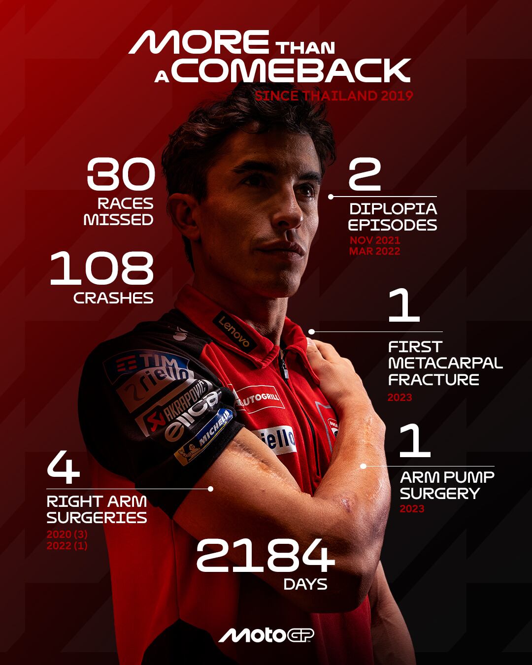 Entre sus incidentes en pista sobre una Honda indócil, padeció dos casos de diplopía, específicamente en noviembre de 2021 y marzo de 2022, cuando no pudo correr en Termas de Río Hondo, en Santiago del Estero. Acumuló cuatro operaciones en el brazo derecho y en la última le prometió a su abuelo, el recordado Ramón: “’Te prometo que en el húmero es la última operación, pero déjame probar porque hay una solución y me la están dando. Déjame probarla’”. Marc quiso demostrarse que aún su campaña no estaba terminada. Su última intervención fue a finales de 2023, para solucionar unos problemas de síndrome compartimental. Antes, ese año también sufrió una fractura del primer metacarpiano después de un accidente en Portimao. El fisioterapeuta Carlos J. García destacó que el retorno del piloto no encuentra comparativo en el motociclismo moderno: “No hay reaparición comparable a la de Marc”.
