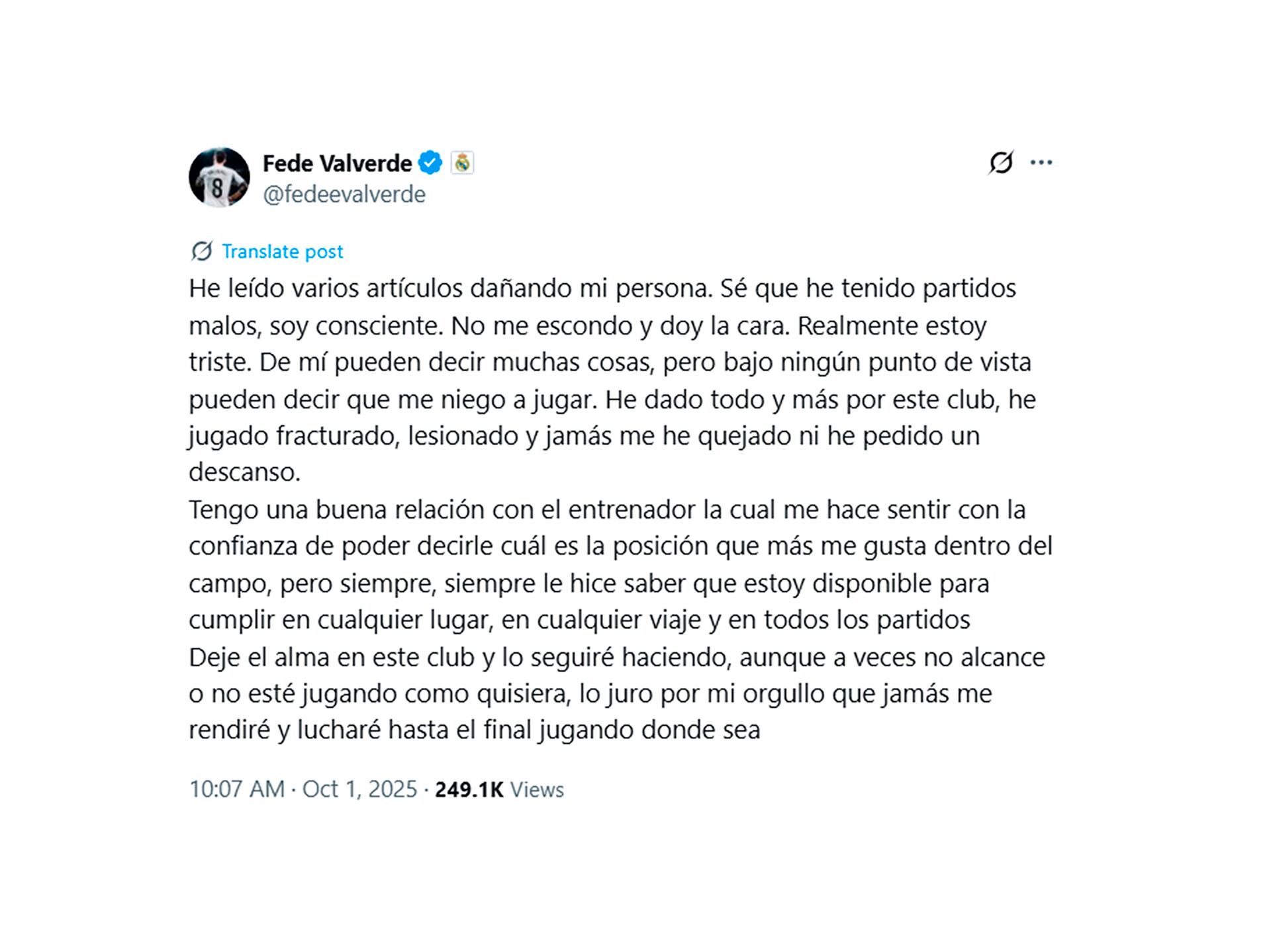 El propio Xabi Alonso, que semanas atrás debió contestar por una polémica con Vinicius Jr., informó ante la prensa que la suplencia del futbolista charrúa contra el Kairat se definió antes del partido: “Es una decisión que estaba tomada. Fede siempre está dispuesto. Siempre con buena predisposición. Si el partido lo hubiera requerido, hubiera jugado. Como Carreras. Pero hay que dosificar. Hay que saber manejar”.