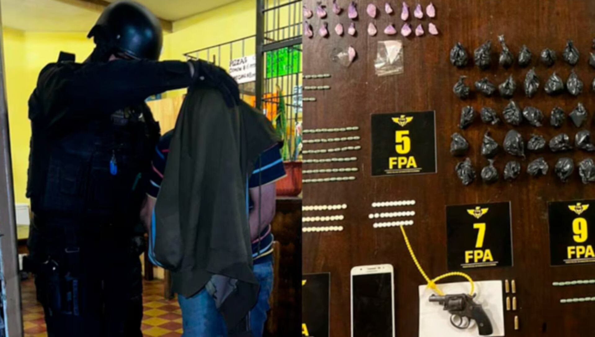 Durante el registro en el local y domicilio del sospechoso, los agentes hallaron 540 dosis de cocaína, 292 de marihuana y 194 comprimidos de psicofármacos. También fueron secuestrados un revólver calibre .22 con cinco cartuchos, dinero en efectivo cuya suma no fue revelada y elementos de corte y fraccionamiento, en línea con lo consignado por la FPA.