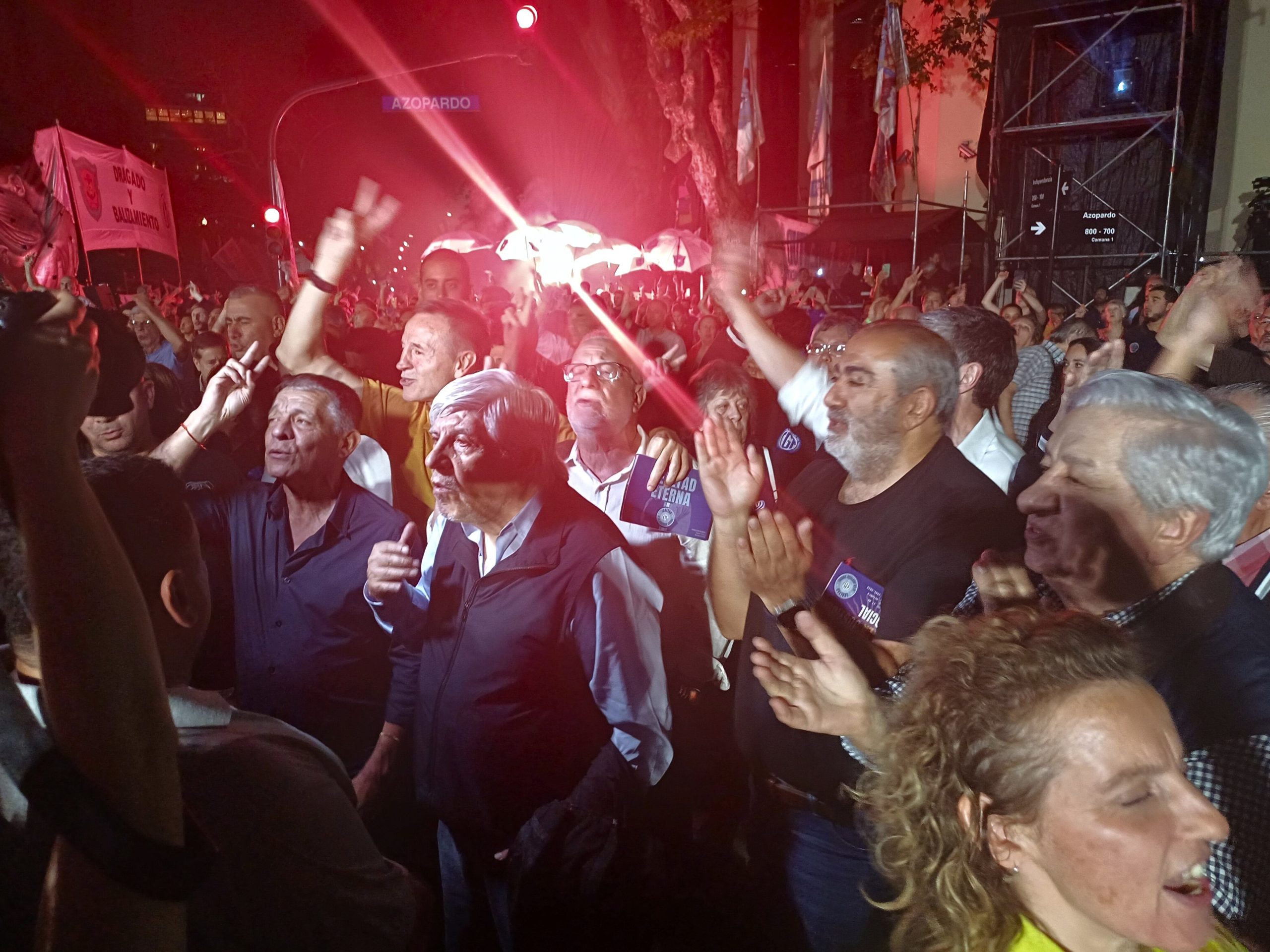 Esa desafiante consigna hizo juego con otra imagen que parecía salida del pasado: Moyano, con sus hijos Hugo Antonio y Jerónimo, llegó rodeado por una corte de fornidos guardaespaldas, una presencia intimidatoria que quizás responda a la feroz interna de Camioneros.