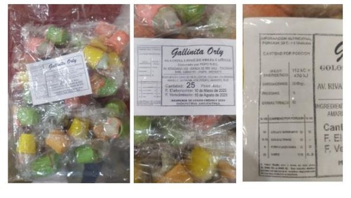 - Gallinita Orly, elaborada con oblea y azúcar, en cualquier presentación, lote y fecha de vencimiento. Se trata de un producto elaborado y envasado por: PEPO S.R.L., Av. Rivadavia 152, Banda del Río Salí- Tucumán.
