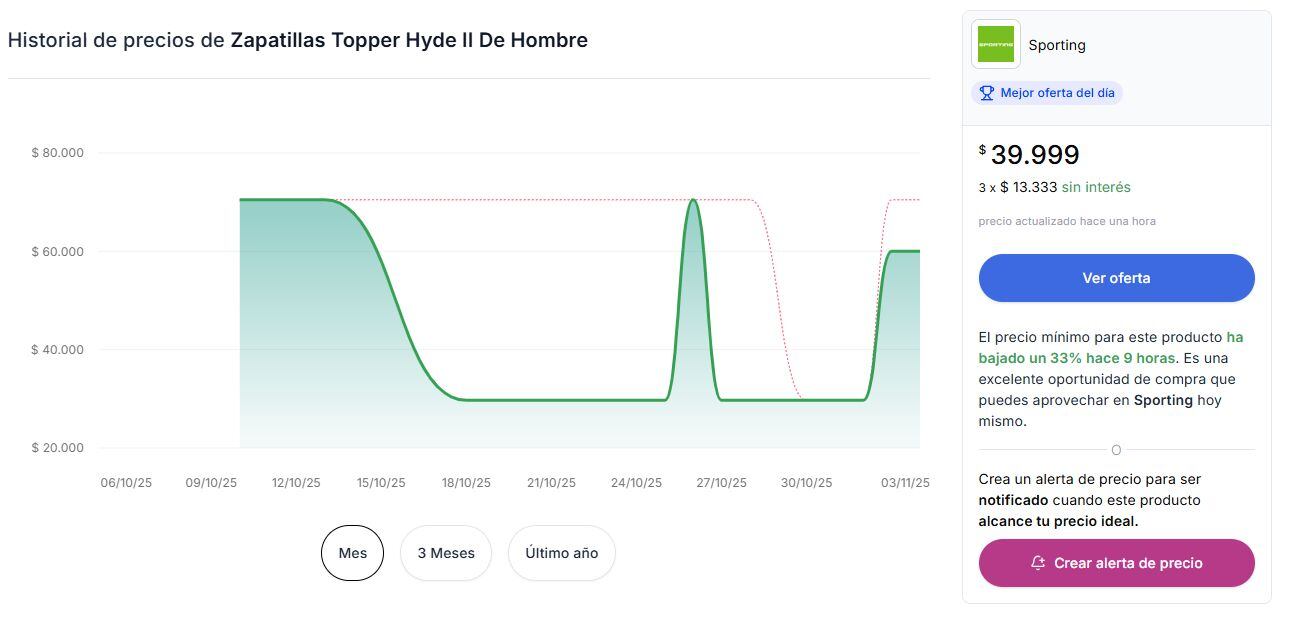 El uso es muy sencillo: los sitios (que no son parte del Cyber Monday; de hecho, funcionan todo el año) tienen algunos productos destacados en la página principal, pero se pueden buscar otros (por marca y modelo) y ver qué tiendas lo ofrecen en este momento (desde cadenas de electrodomésticos hasta cuentas de MercadoLibre), cuál es el precio en cada una de ellas y, el dato clave, cómo fue variando ese precio en las últimas semanas, para comprobar que no haya tenido un pico hace un par de semanas y ahora esté, en oferta, al mismo precio que tenía antes.