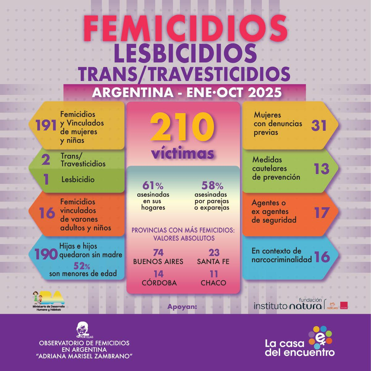 Desde el 1° de enero al 31 de octubre de 2025, se produjeron 191 femicidios y vinculados de mujeres y niñas, 1 lesbicidio, 2 transfemicidios y 16 femicidios vinculados de varones adultos y niños.