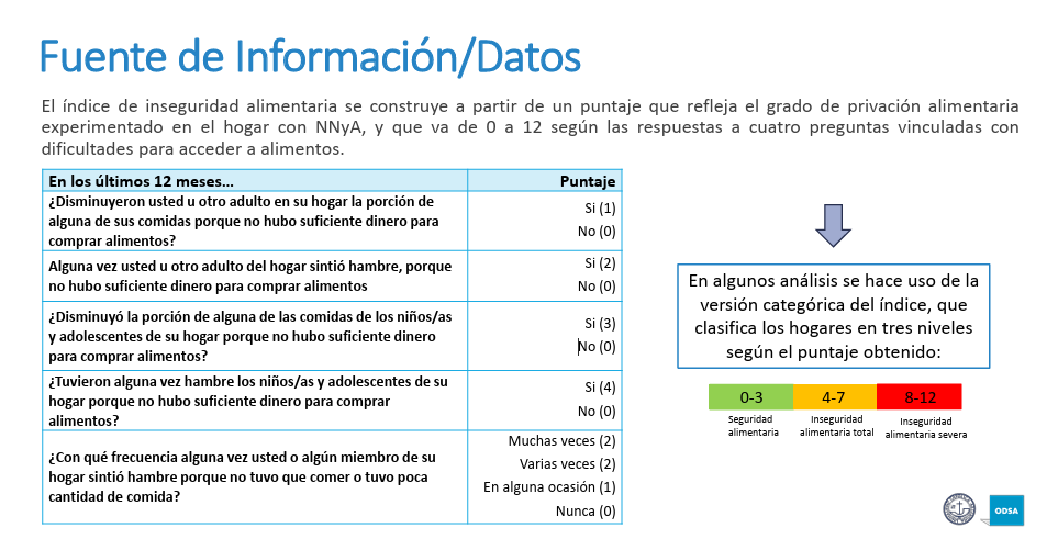 El índice de inseguridad alimentaria se construyó a partir de un puntaje (de 0 a 12) que refleja el grado de privación alimentaria en hogares con niños, niñas y adolescentes, basado en las respuestas a cinco preguntas.