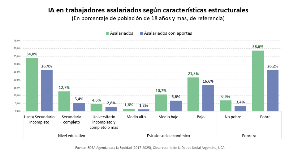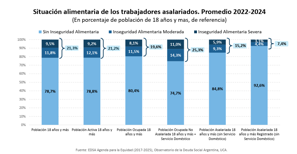 El estudio destaca que los trabajadores asalariados, aun con inserción formal, no están exentos del problema. La inseguridad alimentaria afecta al 15,2% de los trabajadores asalariados y al 7,4% de aquellos con empleo formal. El porcentaje de afectados se eleva al 25,3% en la población ocupada no asalariada, que incluye a cuentapropistas, precarizados, y trabajadoras de servicio doméstico.