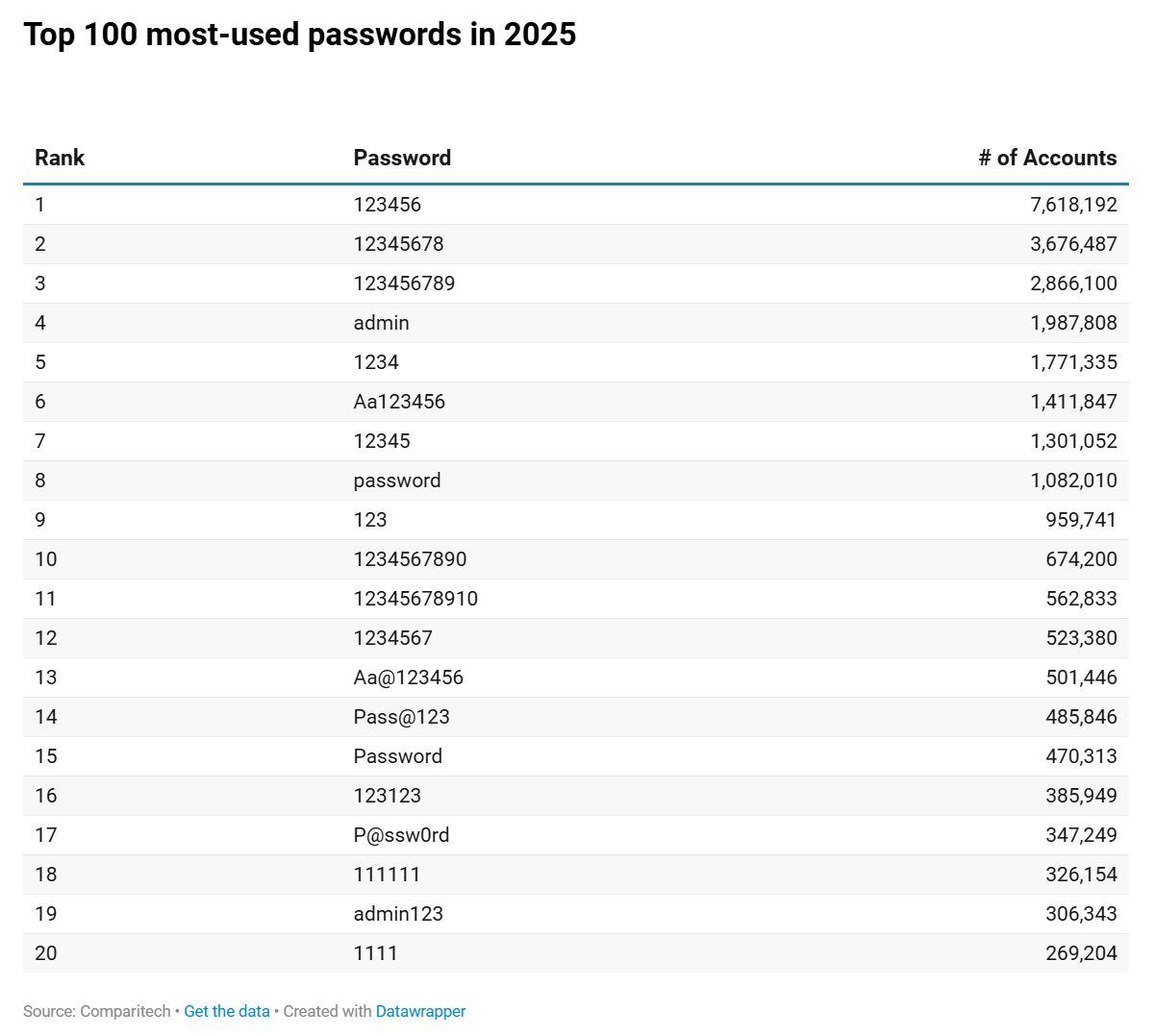 El portal especializado Comparitech ha reunido las cien contraseñas más utilizadas en 2025, una tabla que han obtenido a partir de los datos agregados de más de 2000 millones de credenciales de cuentas filtradas en canales delictivos, después de comprobar los que estaban actualizados al presente año.