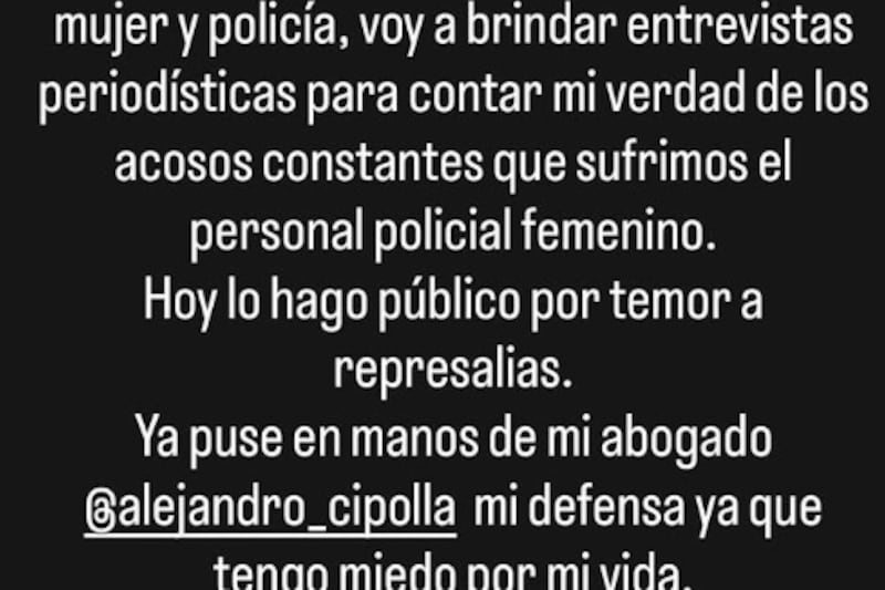 Después de la repercusión y las consecuencias, Nicole realizó un posteo en sus historias de Instagram donde contó haber sido acosada por “el mero hecho de ser mujer y policía”, y aseguró que permitirá ser entrevistada por los medios para contar su versión de los hechos. “Hoy lo hago público por temor a represalias. Ya puse en manos de mi abogado, Alejandro Cipolla, ya que tengo miedo por mi vida”, explicó.
