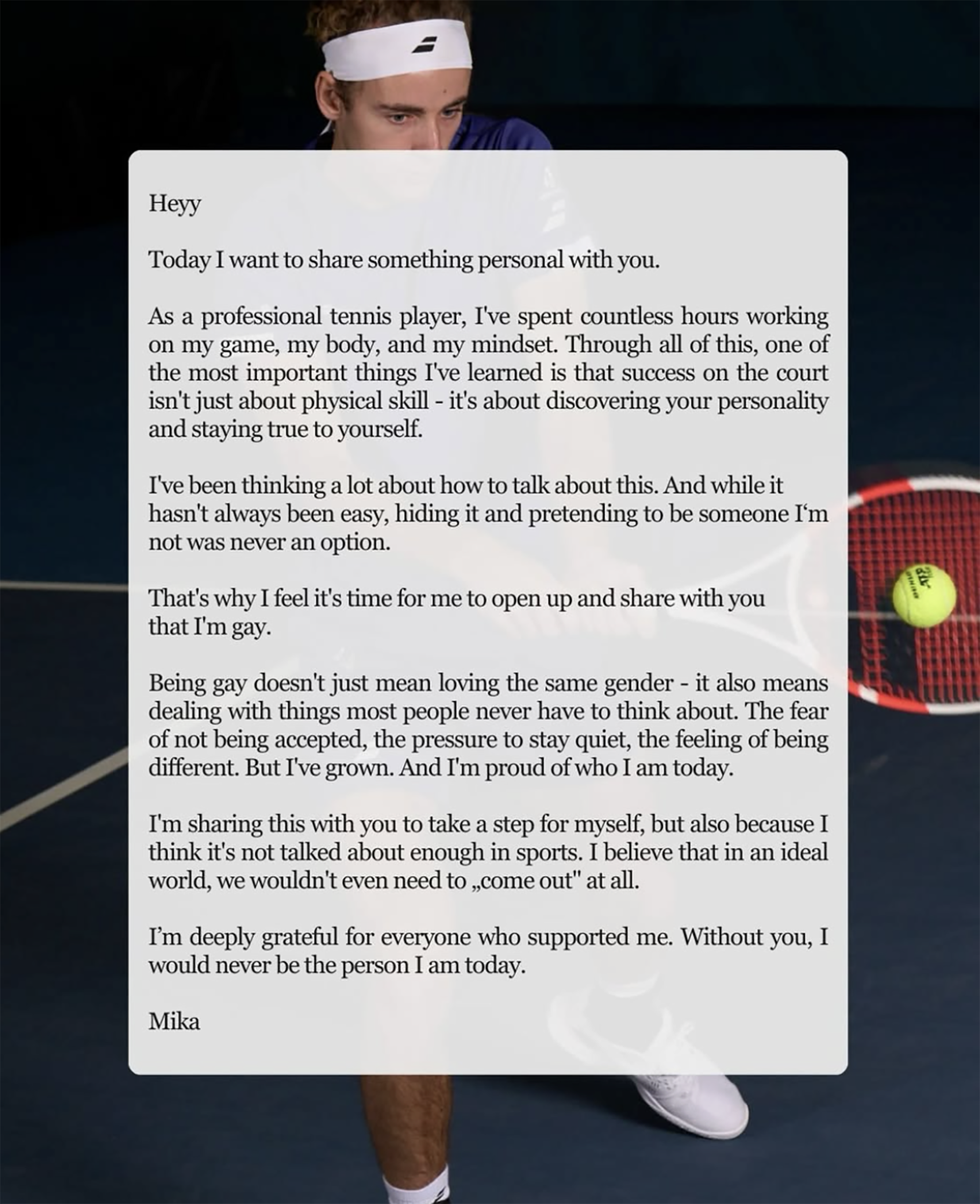 “Como jugador profesional de tenis, he pasado incontables horas trabajando en mi juego, mi cuerpo y mi mentalidad. A través de todo esto, una de las cosas más importantes que aprendí es que el éxito en la cancha no se trata solo de habilidad física: también se trata de descubrir tu personalidad y mantenerte fiel a quien sos. He estado pensando mucho en cómo hablar de esto. Y aunque no siempre fue fácil, ocultarlo y fingir ser alguien que no soy nunca fue una opción. Por eso siento que es momento de abrirme y compartir con ustedes que soy gay», mencionó en la primera parte de su carta.