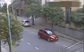 El vehículo esquiva a dos automóviles y un colectivo que salen a su paso y cruza rápidamente por Virgen de la Merced ante la incrédula mirada de un peatón. Al llegar a calle Monteagudo frena bruscamente cuando otro vehículo, que circulaba por calle Monteagudo, dobla por calle Santiago para continuar su camino.